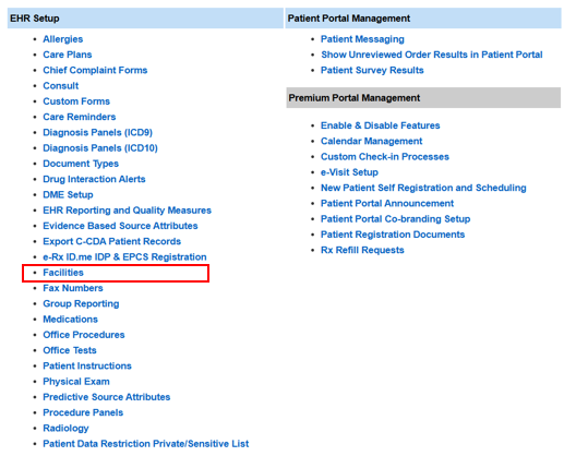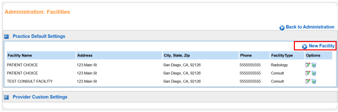 - Note: Facilities can be created at the practice level or for a specific provider by setting up the Provider Custom Settings.