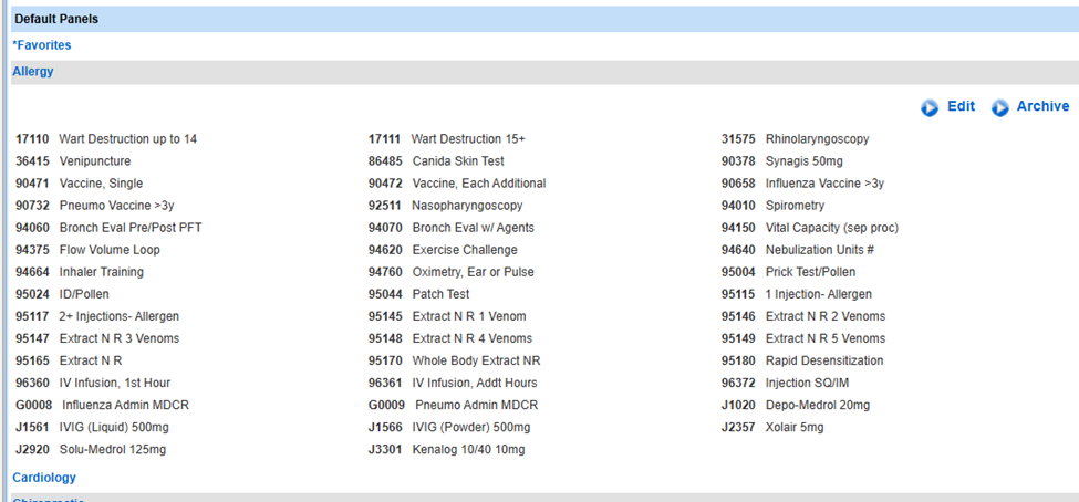 - Select Edit to edit the panel or Archive to remove the panel from the EHR procedure coding panels.