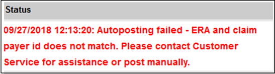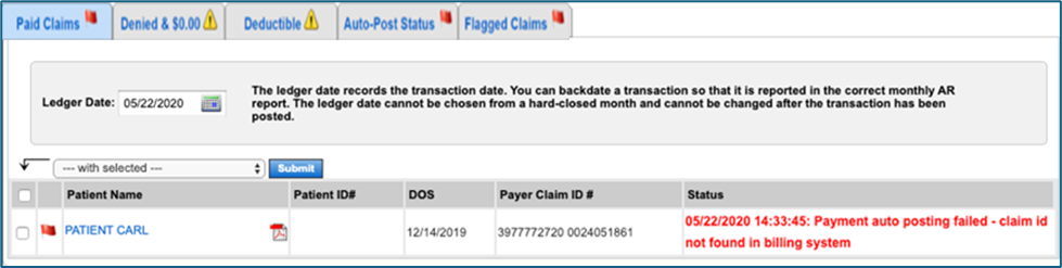 (failed auto-post) appears. - If at least one claim in the ERA successfully auto-posts, then the check will be successfully posted in the system. If a flag appears, you may need to do some follow up on that claim.