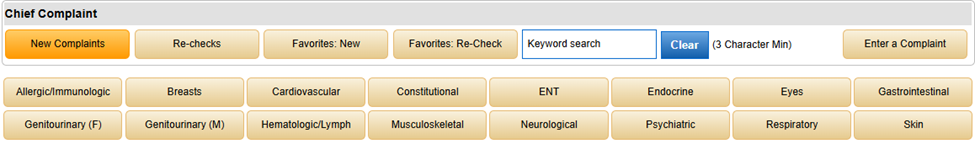 • Select New Complaints, Re-checks, Favorites: New, or Favorites: Re-Check. These options determine which questions display. Selecting Favorites allows for quick access to common complaints.