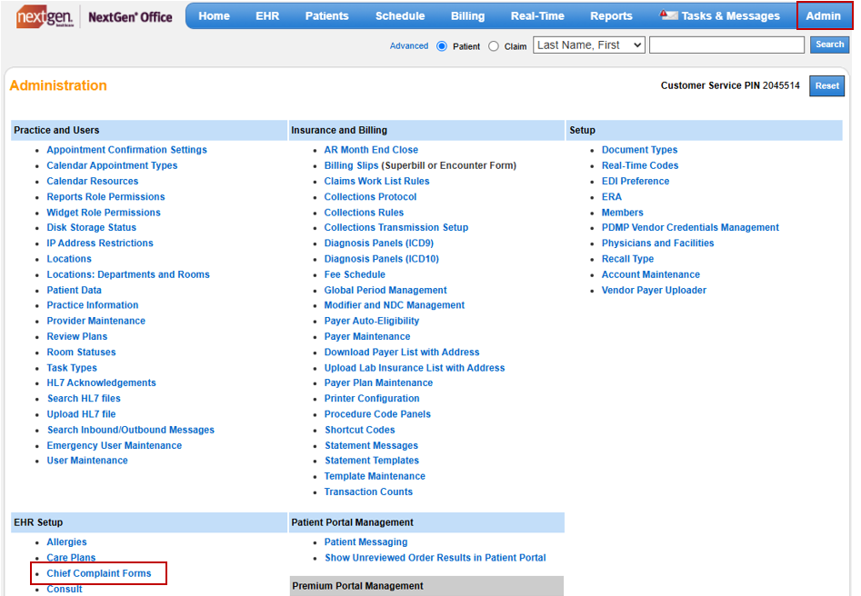• To view a variety of default complaint forms, click Admin on the menu bar and then click Chief Complaint Forms.