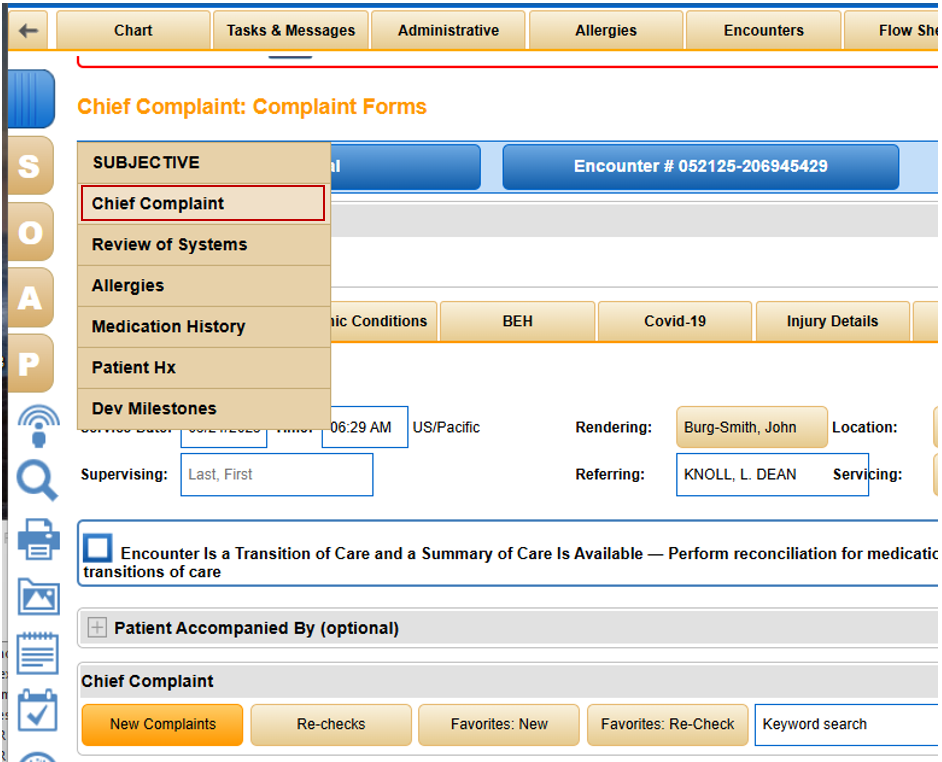 • While in an encounter, click S on the SOAP menu and then select Chief Complaint.