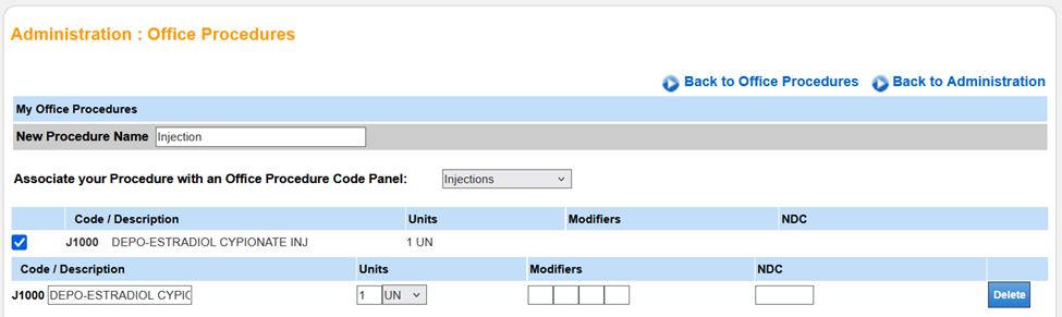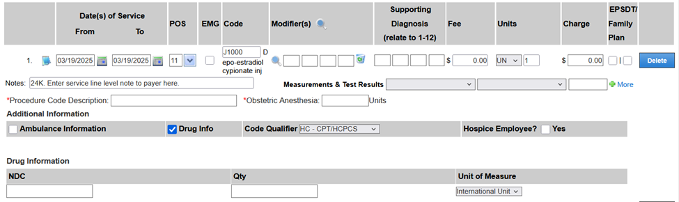 - Confirm default Units, Modifiers, and NDC code.
