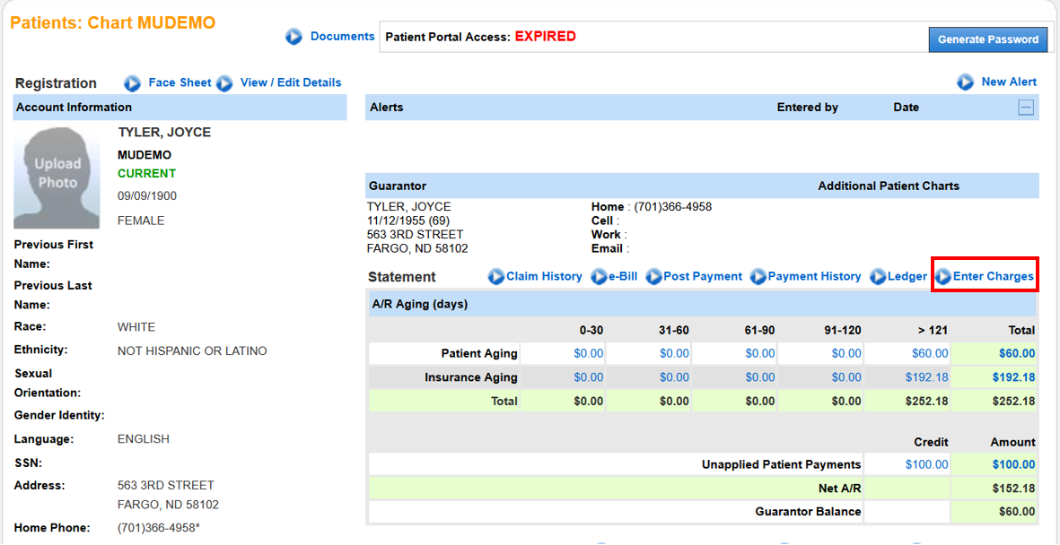 - Once within a patient’s chart, hover the cursor over Billing and select Enter Charges.
