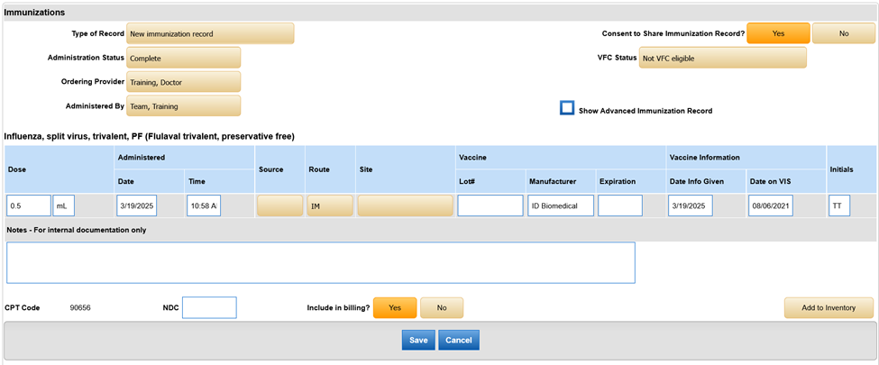- Fill in the injections remaining (optional; this feature will count down the remaining immunizations each time this immunization is given to the patient in the future).