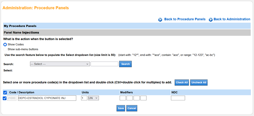 - If Show codes is selected, search for and add procedures as explained above. Add Units, Modifiers and NDC codes, if desired.