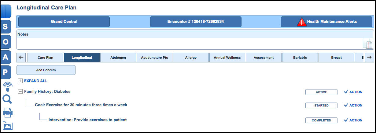 You can use Longitudinal Care Plan (LCP) to manage a patient's health concern information. For instructions on adding health concerns to a patient's care plan, refer to Add Health Concerns to a Patient's Care Plan.