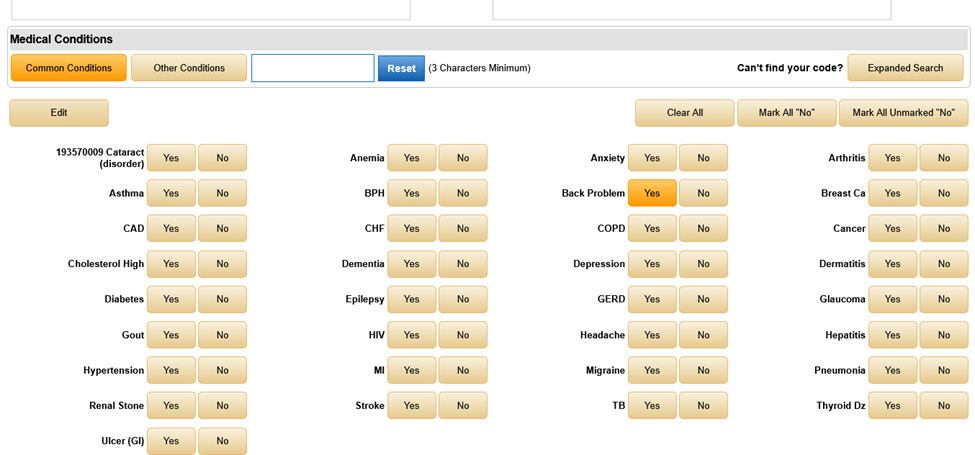 - Select the conditions that the patient confirms or denies from the Common Conditions buttons.