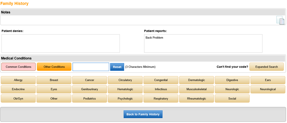 The Family Hx section allows the user to easily add a patient’s family members to the system, including family members’ medical histories and their positive and negative conditions.