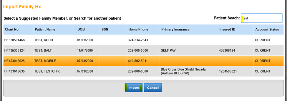 - Click Import Family HX to import family members from another patient’s chart.