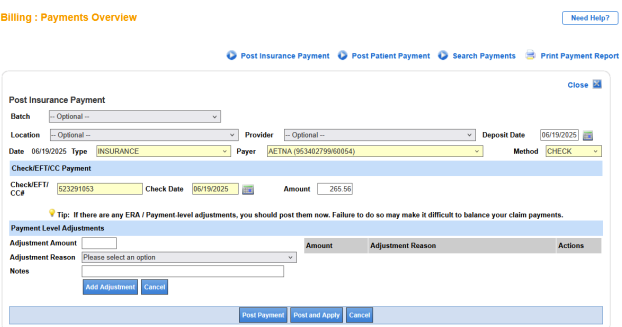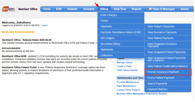 - Hover over Billing, select Payments, and then click Post an Insurance Payment.