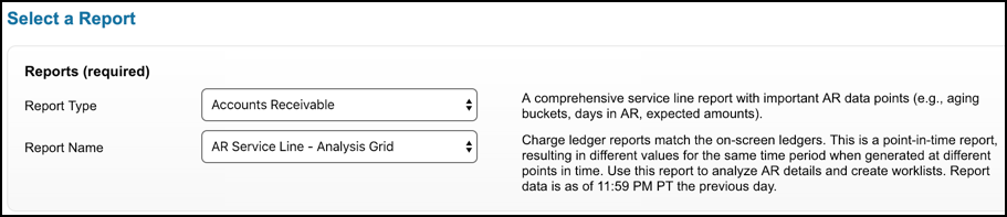 - The reporting period is not required on the Reports home page for AR summary reports; therefore, if you do not select a reporting period on the home page, this option is not available on the selected report's page.