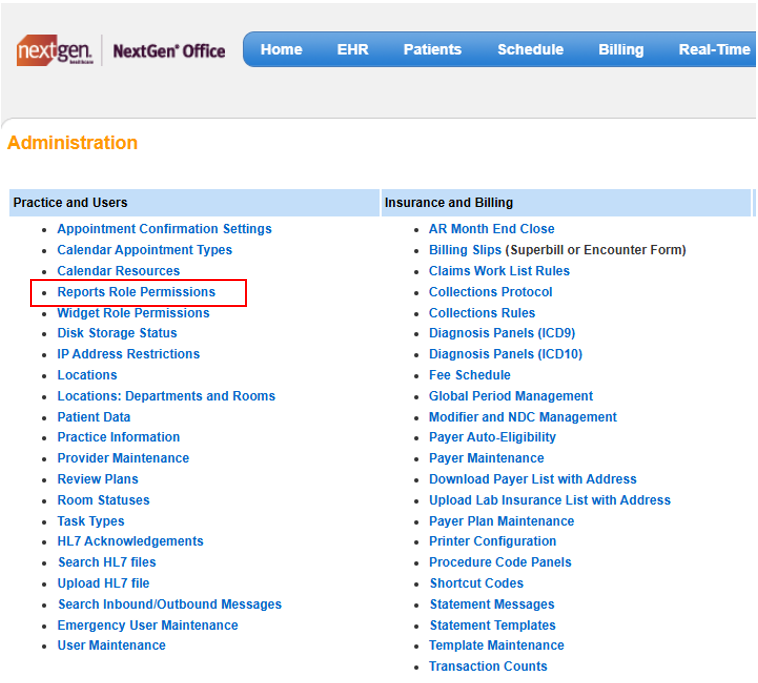 Practices assign permissions to Reports Reporting Suite for each practice role. NextGen Office sets default reports role permissions, but each practice can customize them. These roles can then be assigned to Users in Administration: User Maintenance: Reporting Roles.